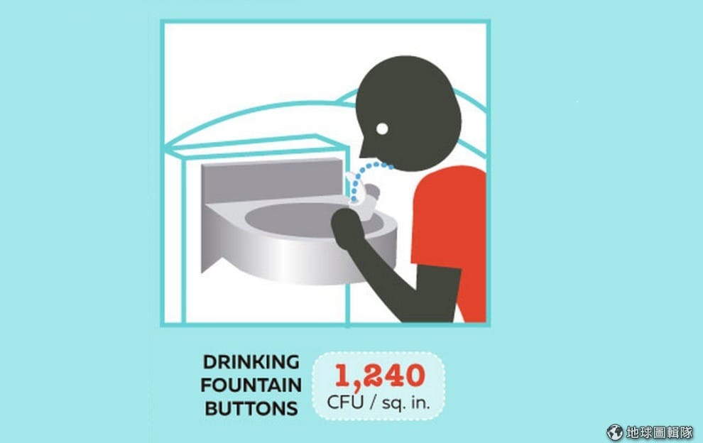 網友渴了嗎?機場隨處可見的飲水機的按鈕上,每平方英寸有 1,240個CFU。Photo credit: Travelmath