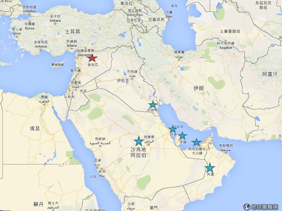 海灣國家指的是指巴林、科威特、阿曼、卡達、沙烏地阿拉伯和阿拉伯聯合大公國(上圖藍色星星國家),這幾個國家都在波斯灣周圍,地理位置靠近敘利亞(上圖紅色星星處)。根據《維基百科》,海灣國家因為文化、音樂特色相似,居民也都使用阿拉伯語,常會被當成一個整體來討論。