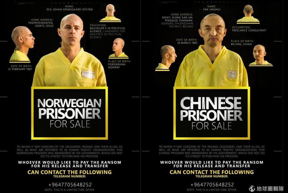 被伊斯蘭國擄獲的中國人質是現年 50歲的范靜輝(音譯,Fan Jinghui),他是來自北京的顧問,而挪威人質是現年 48歲的奧夫斯塔德(Ole Johan Grimsgaard-Ofstad),他目前正在攻讀社會科學碩士。他們兩人身穿黃色的連身裝直視鏡頭,而在他們的肖像底下出現「出售」字眼。