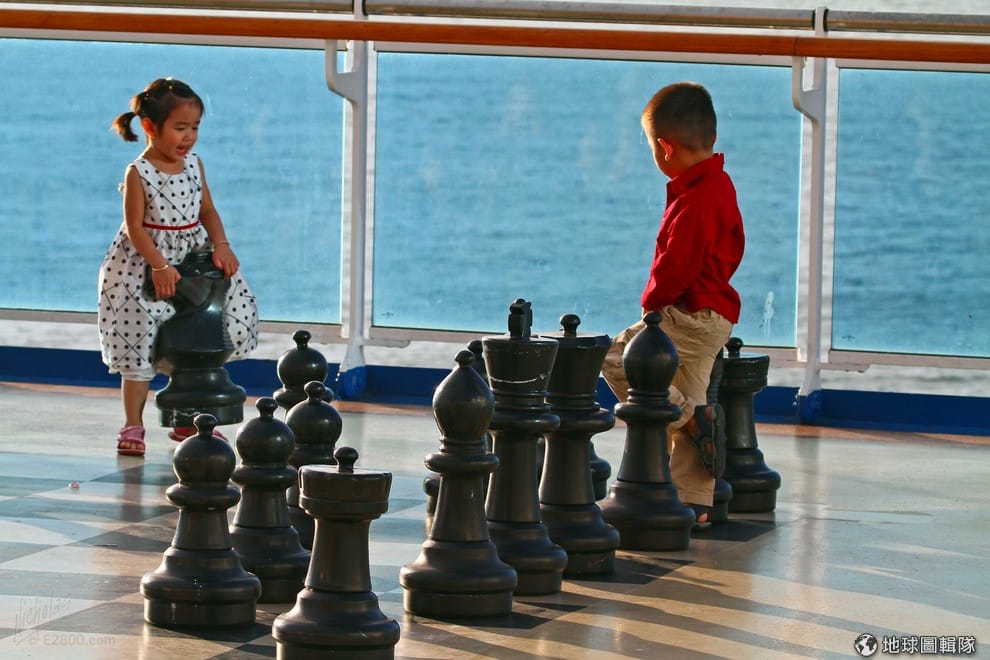 小朋友們在遊輪上玩著大型的西洋棋。Photo credit: Nicholas D.
