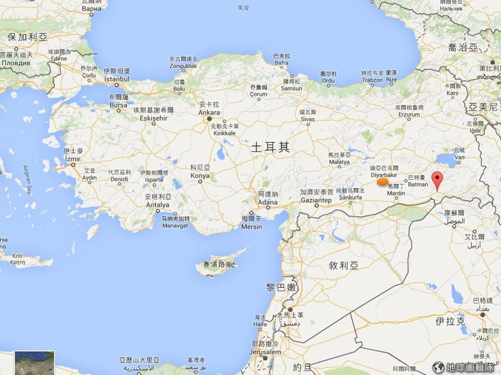 圖中橘色圓點是土耳其的迪亞巴克爾市,迪亞巴克爾總共住了將近 1百萬名民眾。這裡的居民大多是庫德人,一直是PKK與土耳其政府對戰的中心點。紅點則是捨爾納克鎮,星期日的時候土耳其警察和PKK在這裡發生衝突,造成 8人死亡。