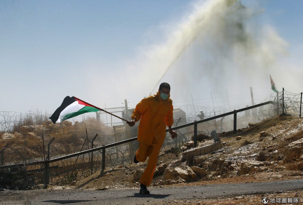 一名舉著巴勒斯坦國旗的民眾慌亂地逃跑,他身後的武裝水車正在噴灑臭鼬水。