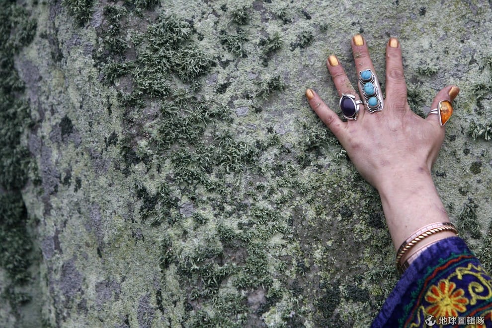 一名女性摸著巨石陣的其中一塊巨石。