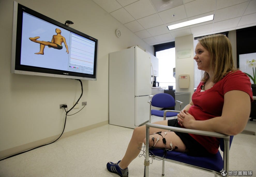 路透社虛擬實境可以協助患者去適應並操控接下來的仿生義肢,圖中的海莉(Hailey Daniswicz)因為骨癌失去了左腳有 12年之久,她正在練習操控電腦中的腿做出伸展。