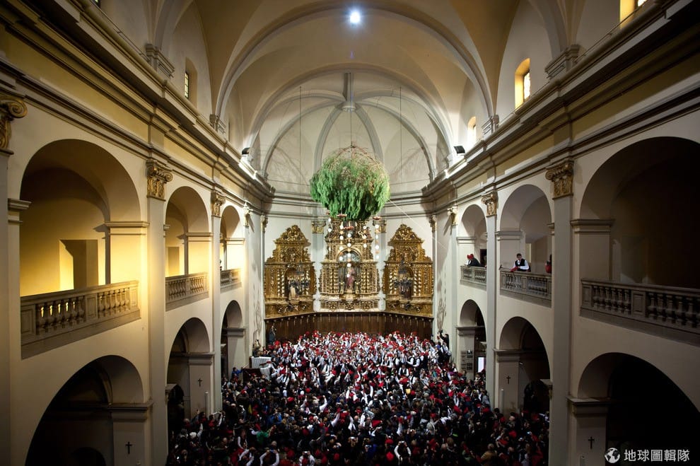 合力砍下松樹後,居民們會用牛車把樹運到教堂,再用五大綑蘋果跟塑膠圓片組成的裝飾品替這漂亮的祭品松樹妝點一番,最後,整場活動的高潮就是大家一同看著松樹緩緩高掛空中,每個人在樹下開始手舞足蹈、吆喝歌唱,一齊祈求來年又是個生生不息的豐收年!David Ramos/Getty Images