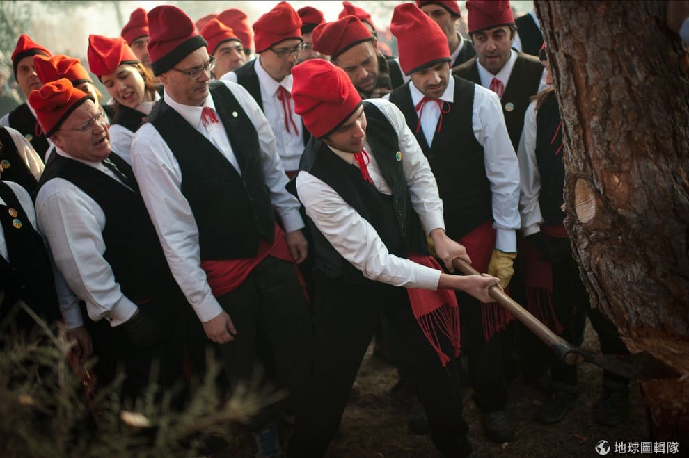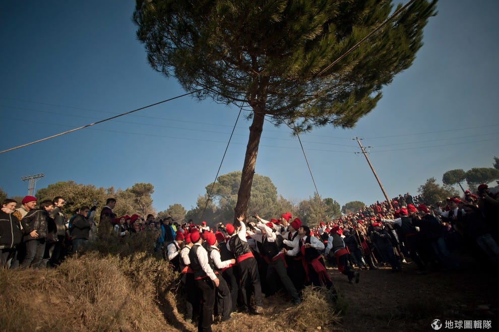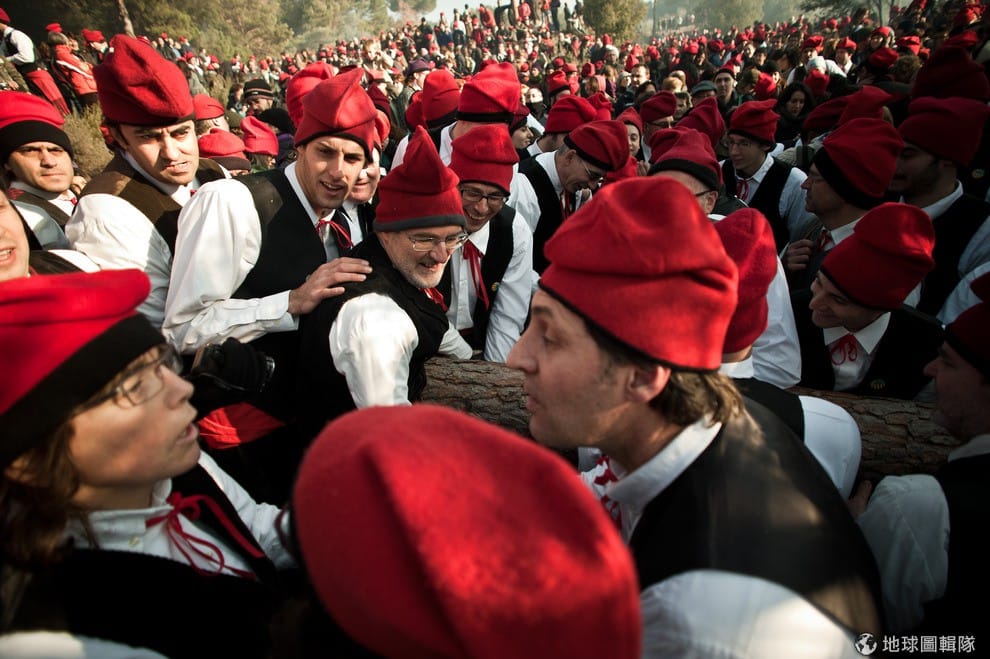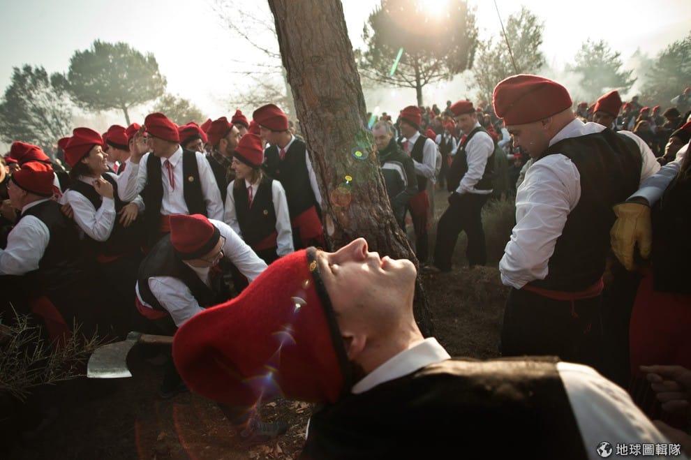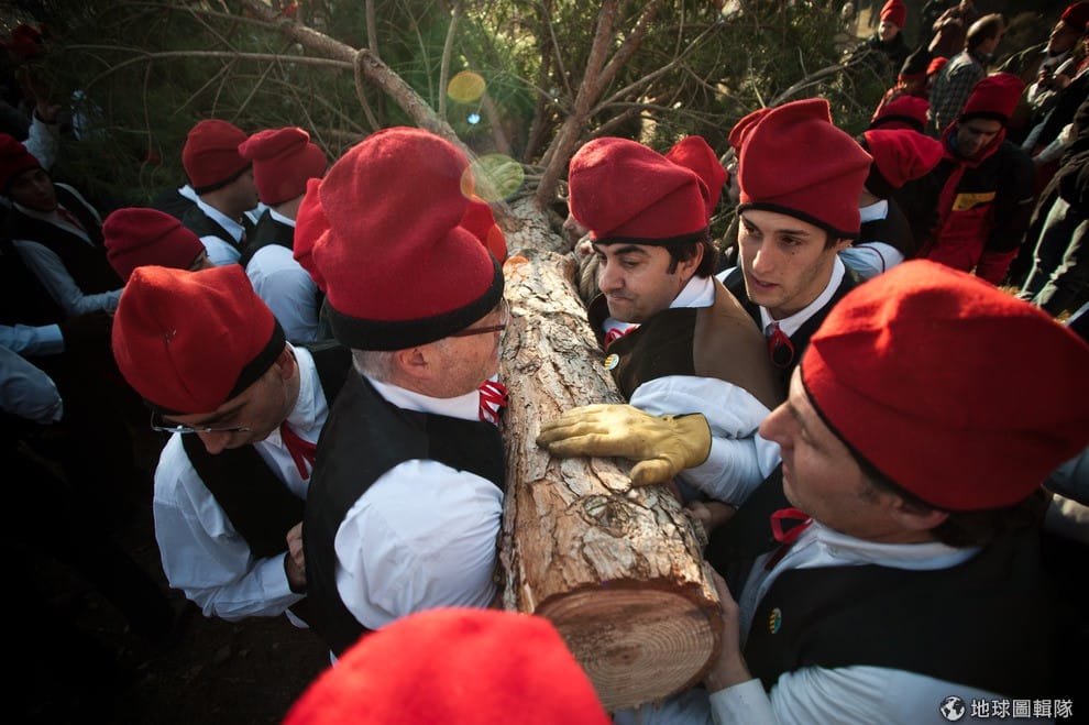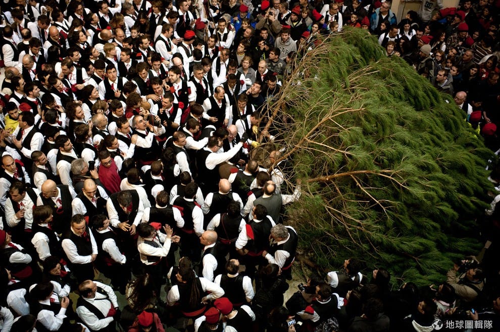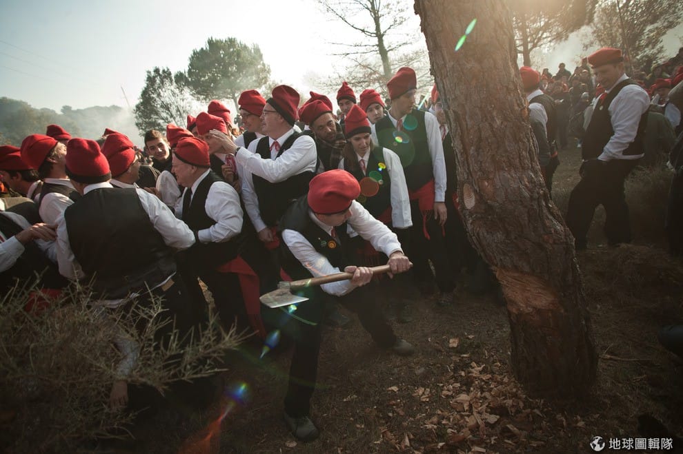 位在巴塞隆納的「聖特里斯」(Centelles)小鎮,居民在冬至時期會舉辦大型的「松樹祭」(La Festa del Pi);慶典期間,只要是出生在當地的居民,會通通換上傳統服飾,同時把代表他們的紅色穿戴滿身,整裝完畢的居民會再抓起步槍、大夥相約衝進森林中找尋最適合當「祭品」的松樹。David Ramos/Getty Images