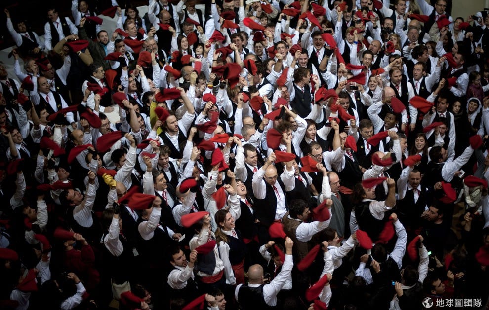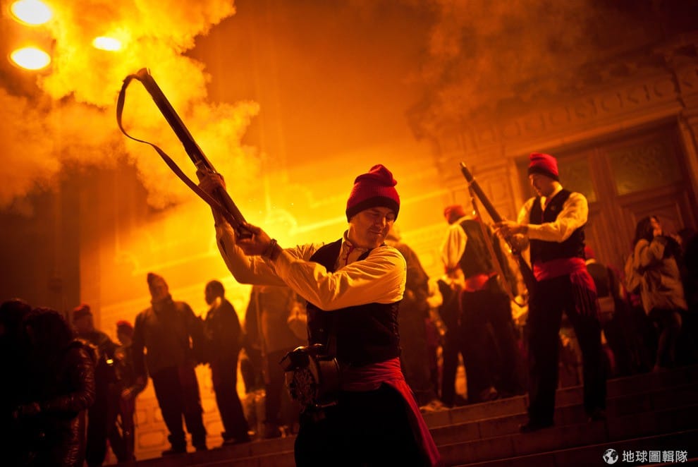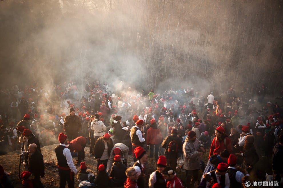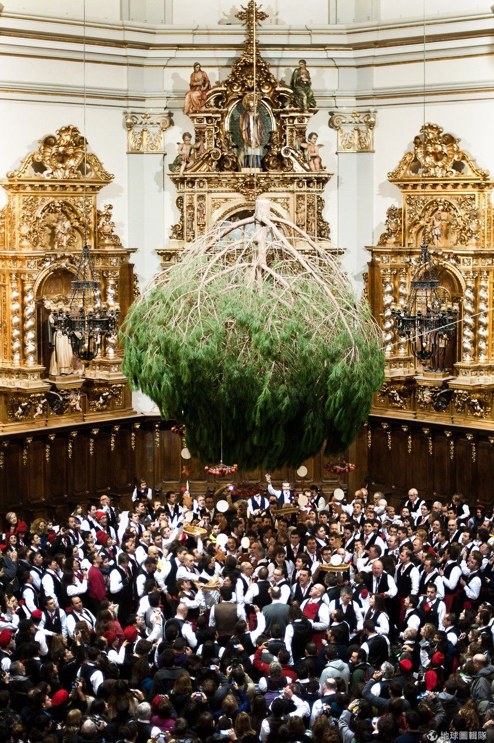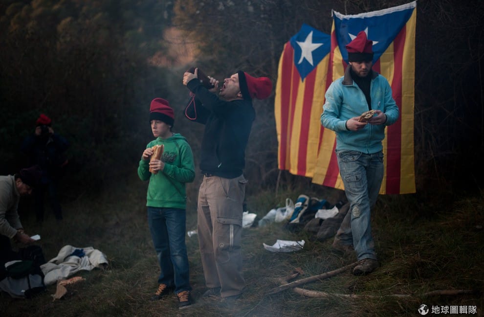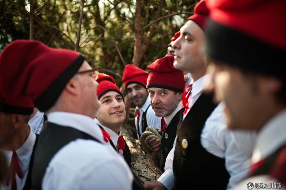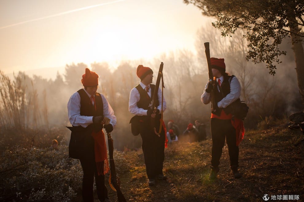 位在巴塞隆納的「聖特里斯」(Centelles)小鎮,居民在冬至時期會舉辦大型的「松樹祭」(La Festa del Pi);慶典期間,只要是出生在當地的居民,會通通換上傳統服飾,同時把代表他們的紅色穿戴滿身,整裝完畢的居民會再抓起步槍、大夥相約衝進森林中找尋最適合當「祭品」的松樹。David Ramos/Getty Images