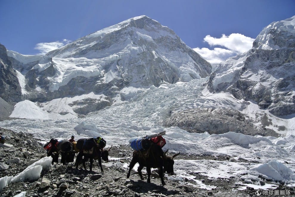 世界第一高峰聖母峰是許多登山客的夢想。圖為專門幫登山客駝運行李的犛牛,正緩緩走向聖母峰上的營地。