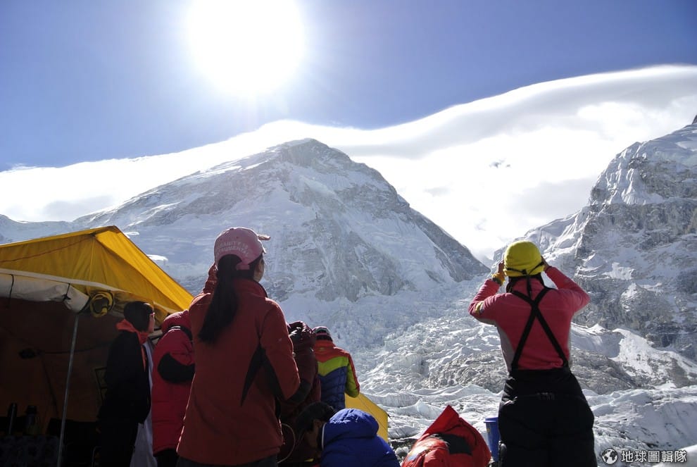 一群在聖母峰駐紮的登山客,紛紛跑出帳篷外觀看前方的雪崩。