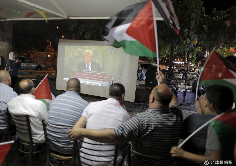 看著巴勒斯坦總統演講轉播的巴國人,揮舞著國旗。