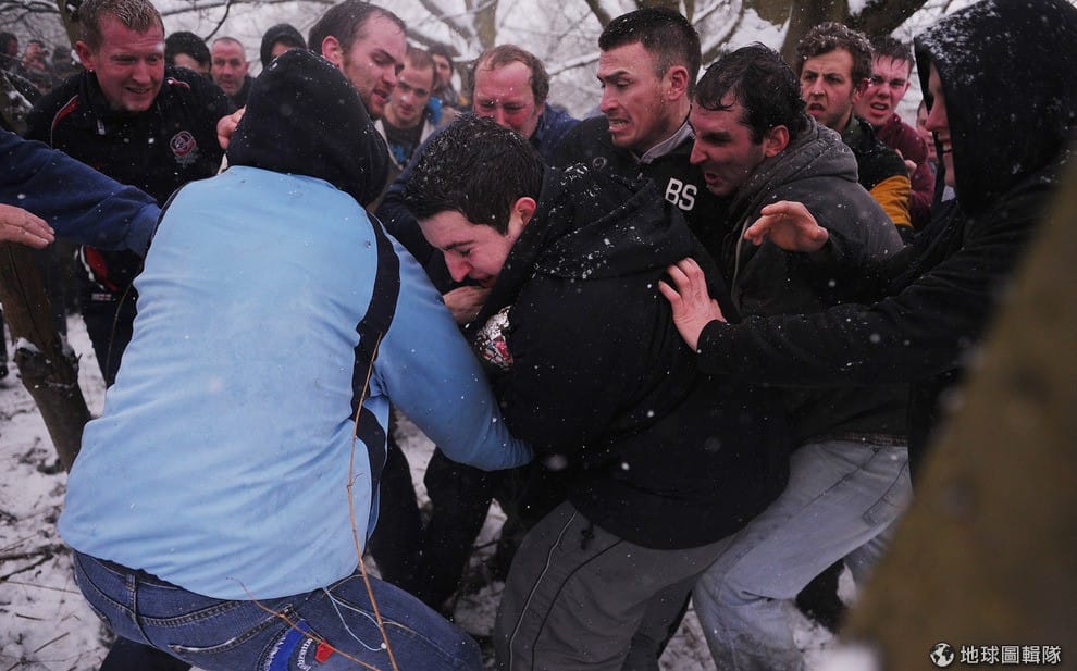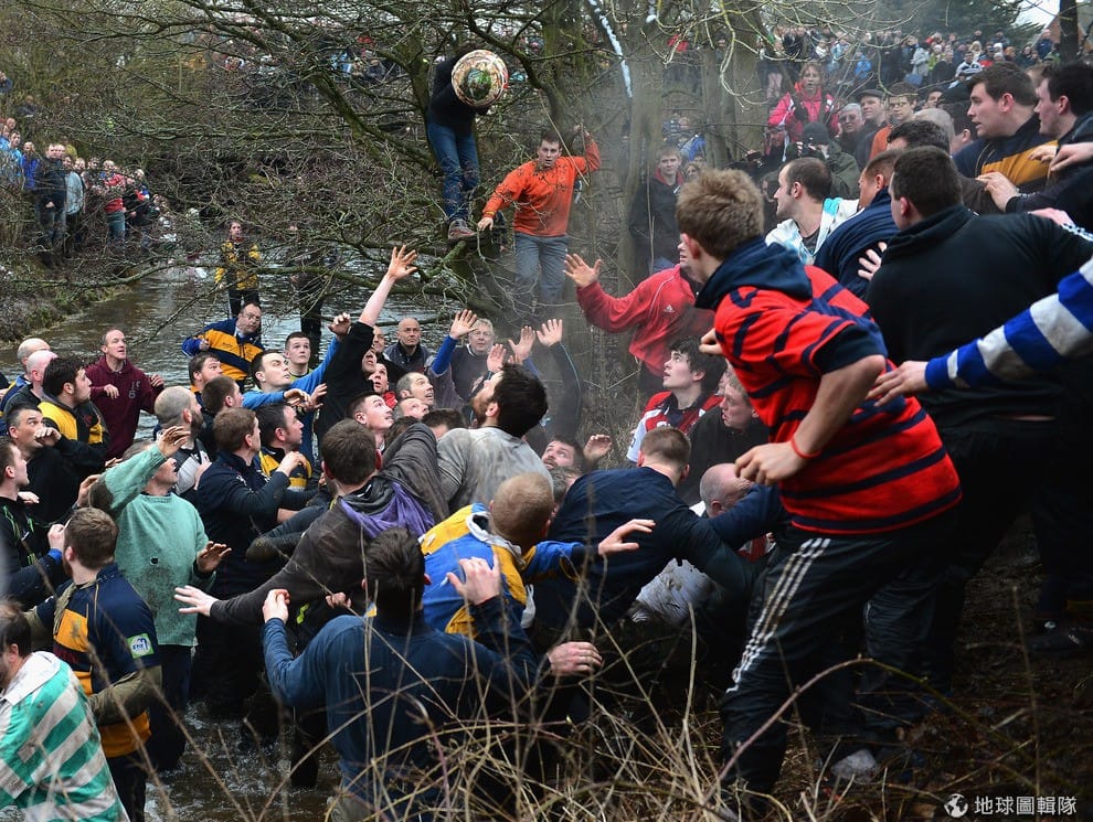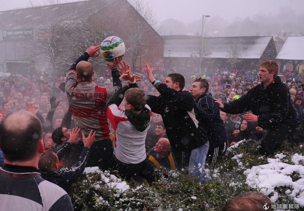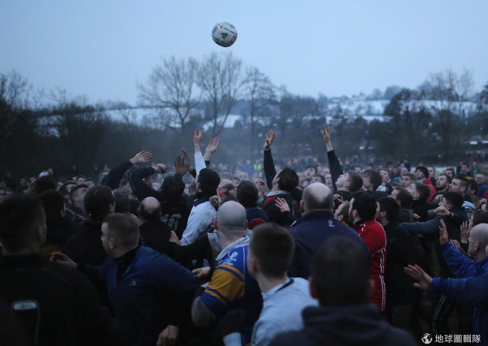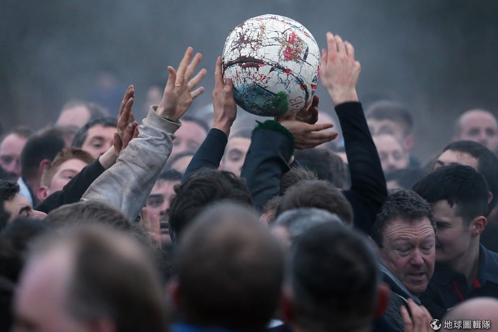 最特別的是,這比賽雖然叫做「足球」,但其實競賽隊伍都是用上半身來傳球,所以這項運動也有「抱抱球」(hugball)的別稱!將近上千位的參賽者用一連串的撲抱動作傳球,氣氛激烈又充滿危險,此外,比賽的得分方式與傳統把球踢進對方球門的規範不同,參賽球員要盡可能把球「帶回」自己屬地,並擊中自己地盤內的「石磨」3次(賽事規範見文末)。Michael Regan/Getty Images