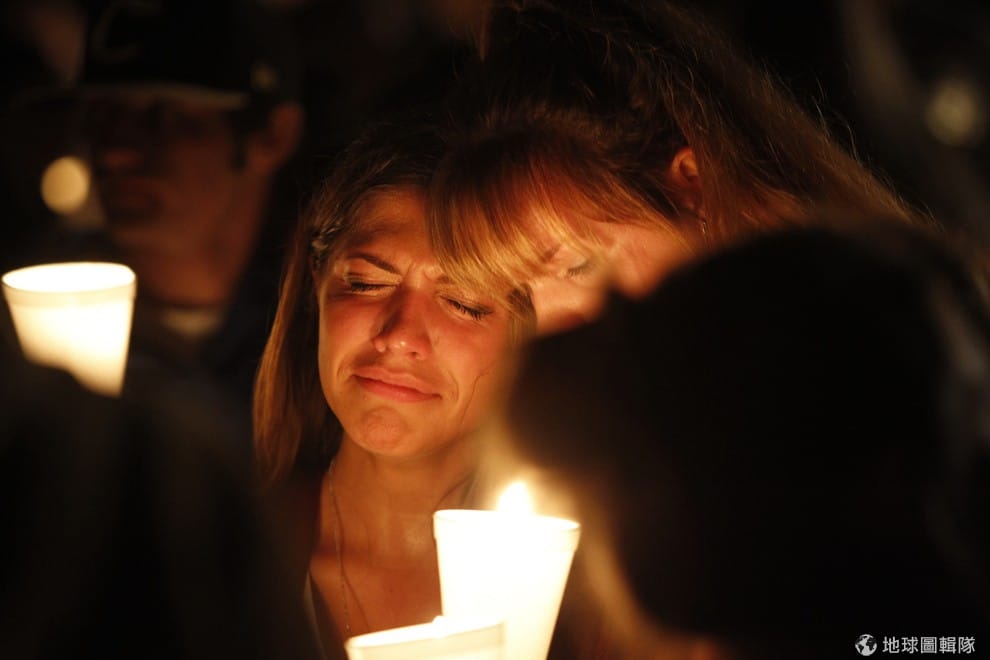 深夜,人們齊聚一堂為這次的校園槍擊案哀悼,現場一片哀戚。