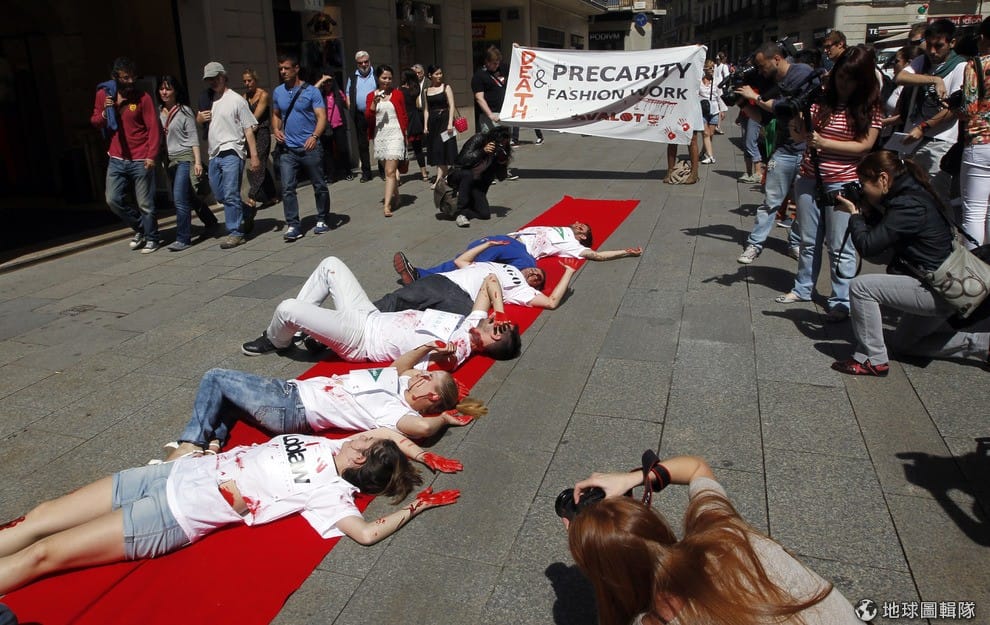 一群人權分子不滿國際大廠剝削孟加拉成衣廠的廉價勞力,躺在地上將手塗成紅色,象徵孟加拉工人的鮮血。