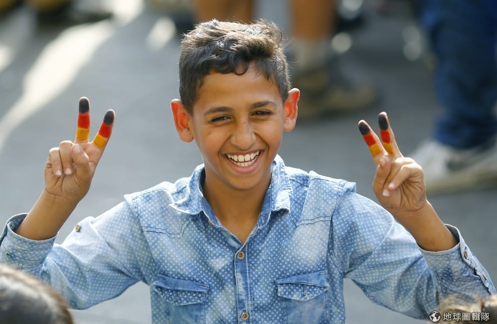 一名難民少年將手指頭塗成德國國旗黑紅黃三色,開心地對著鏡頭展露笑容。