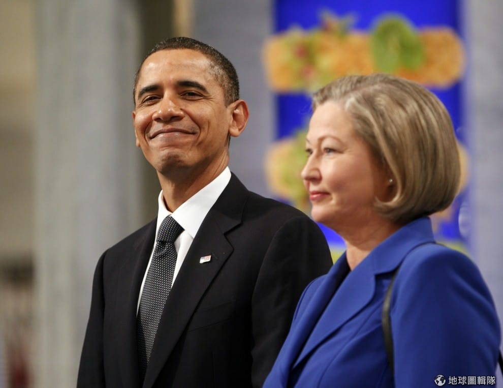 2009年,美國總統歐巴馬(圖左)來到挪威首都奧斯陸領取諾貝爾和平獎,留下了和諾貝爾委員會成員菲夫(圖右)的合影。