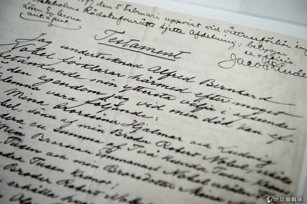 圖中文件為諾貝爾的遺囑,現正存放於瑞典斯德哥爾摩的諾貝爾博物館裡。