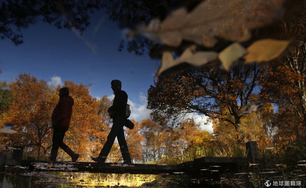 英國的謝菲爾德公園(Sheffield Park Garden)內,清澈的湖水與橘紅綠相間的樹林形成一幅美景。