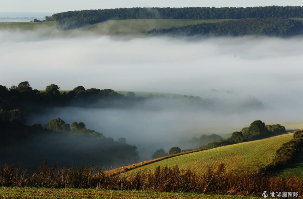 英國南唐斯國家公園(South Downs National Park)內,厚重的霧氣蓋住了整片山區。