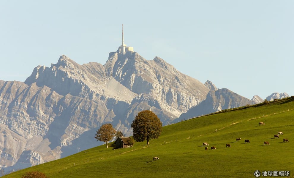 瑞士山坡上,成群牛隻正悠閒的散步,遠處可見美麗的桑蒂絲(Mount Saentis)山景。