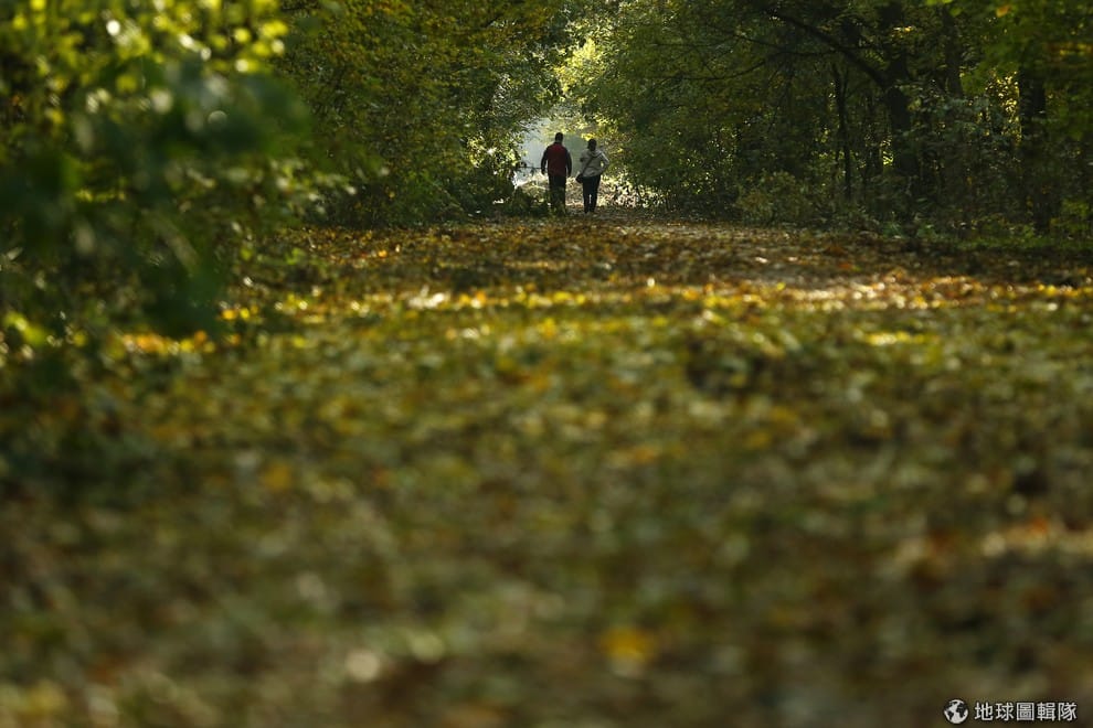 俄國莫斯科一處公園,人們趁著陽光出來的時刻到公園內散步。