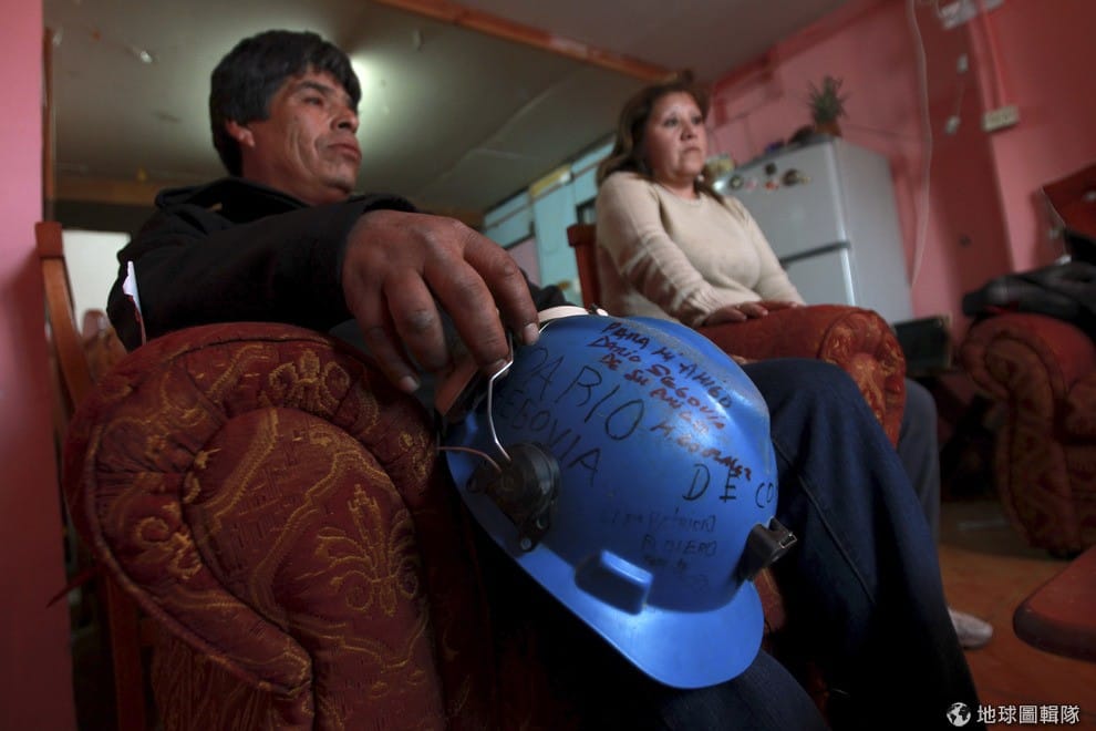 礦工達利歐手上拿著的藍色安全帽上寫著「聖荷西礦工」的字樣,一旁坐著他的妻子。成名後的他們生活並沒有想像中好過,有不少人找不到適當的工作。
