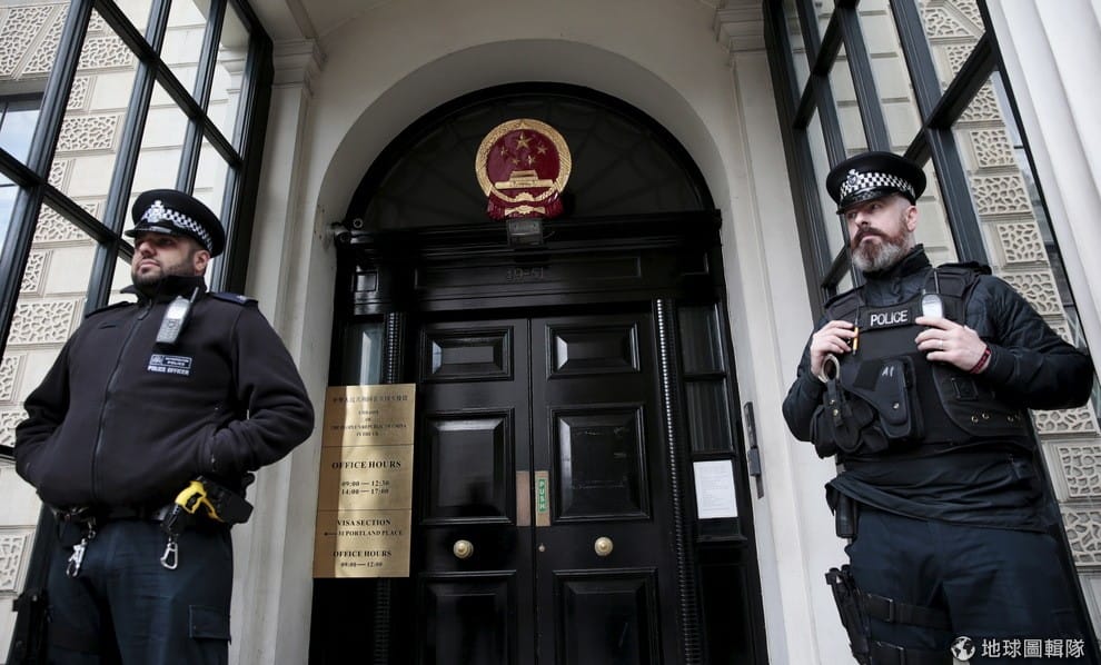 兩名英國警察守在位於倫敦的中國大使館外,等待中國領導人習近平的到來。