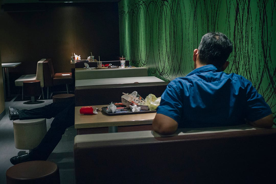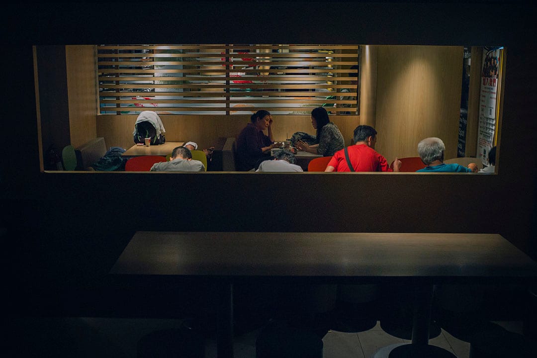 右邊是非正式的睡眠區,每天這個時候都有十多二十人在卡座或是連放在一起的椅上睡着。時間還早,播放的陳奕迅新歌《起點‧終站》有點吵耳,當中兩、三個人似是仍睡不着,在看報紙和戴上耳筒看手機中的電視節目。穿梭左右兩邊世界的是一位老清潔女工,吃的不會到右邊,睡的不會到左邊,各不打擾,一切也似有默契。