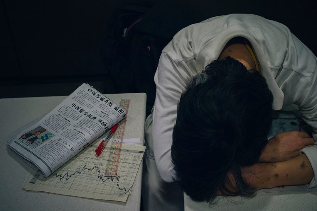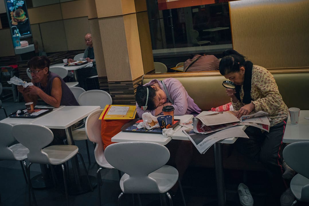 凌晨兩點,荃灣沙咀道麥當勞。推了一架手推車舊報紙來的大叔,枱上放了杯麥當勞紙杯盛的水和一台舊式體積很大的收音機,他邊看那份發黃報紙邊以專家的口吻說:「他每天工時很長,下班就來睡幾小時,不要吵醒他,很可憐啊。」