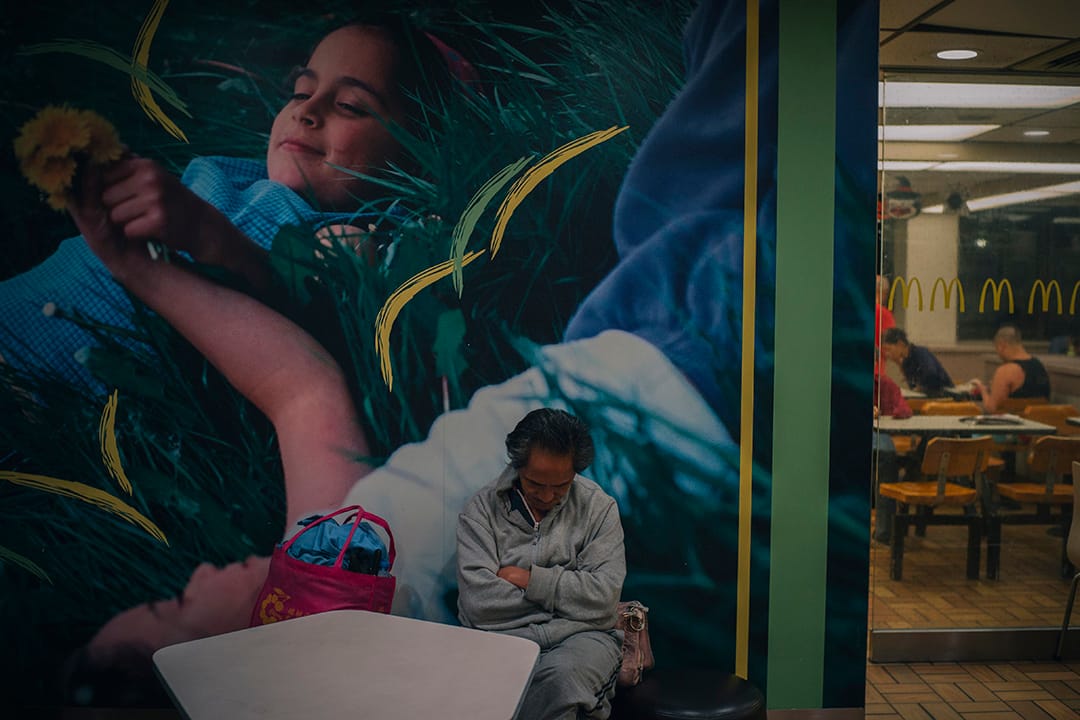 凌晨三點半,深水埗元洲街麥當勞,老婆婆用黑色垃圾袋包着上身,倚伴玻璃而睡,在店外看,她的臉壓在玻璃上和「10元超值選」魚柳飽的廣告牌在一起。這店在街角,老住宅區晚上都關了燈,只有它燈火通明,招牌上的M字特別耀眼。