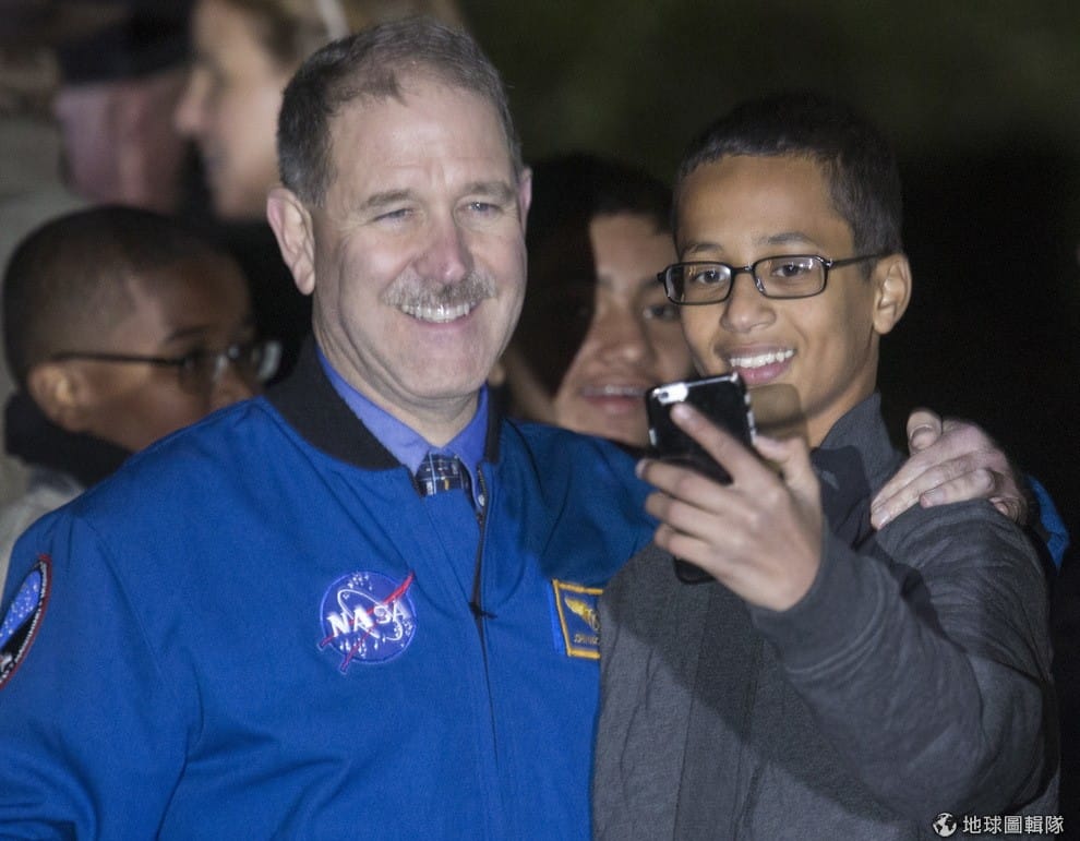 20號發表搬去卡達的前一晚,被大眾暱稱「鬧鐘男孩」的穆罕默德(右)受邀到白宮參加「白宮天文之夜」(White House for Astronomy Night),他在活動現場受到矚目。白宮這項活動的目的,是要讓美國總統鼓勵青年繼續在科學、科技、工程和數學(STEM,science, technology, engineering, and mathematics)上發光發熱。圖中穆罕默德與前NASA太空人與首席科學家的格倫斯菲爾德合照。