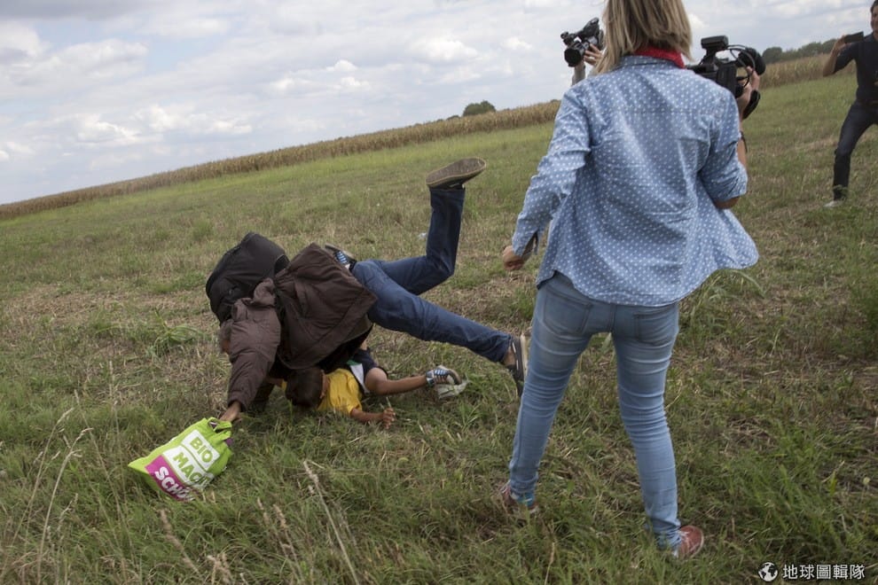 被拉絲洛絆倒的難民摔倒在地,一旁的媒體拍下當時的畫面,拉絲洛立刻成為全民公敵。