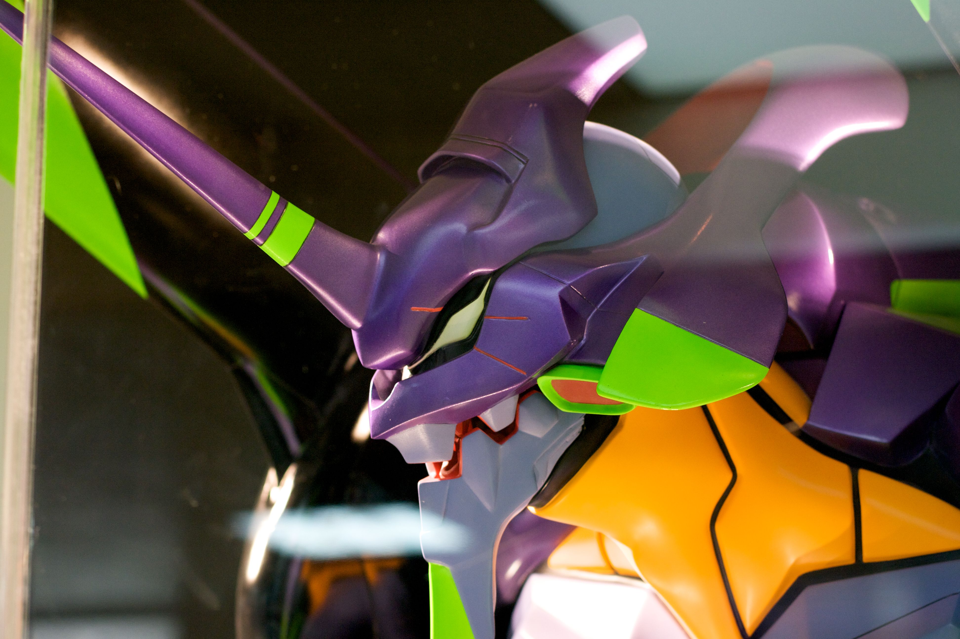「500 TYPE EVA」新幹線列車以 500 系車型進行改造,由導演庵野秀明親自負責監修,並由擔任機械設定的山下いくと(Ikuto Yamashita)操刀設計。除了車身以初號機配色塗裝外,車廂內也有玄機。圖為新世紀福音戰士中的初號機。