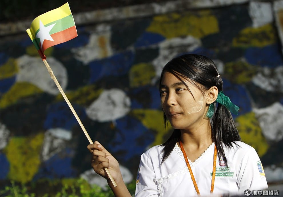 一名緬甸女學生揮舞著黃綠紅交織的緬甸國旗,等著迎接美國總統歐巴馬。