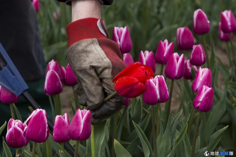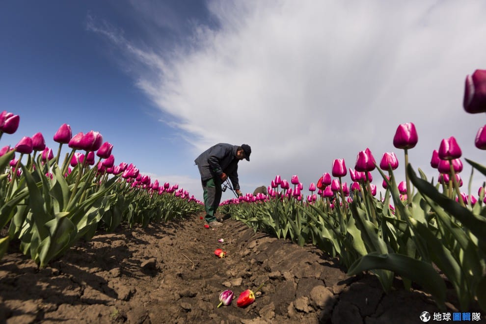 正在專心採下鬱金香花朵的農人。圖片來源:Carsten Koall/Getty Images