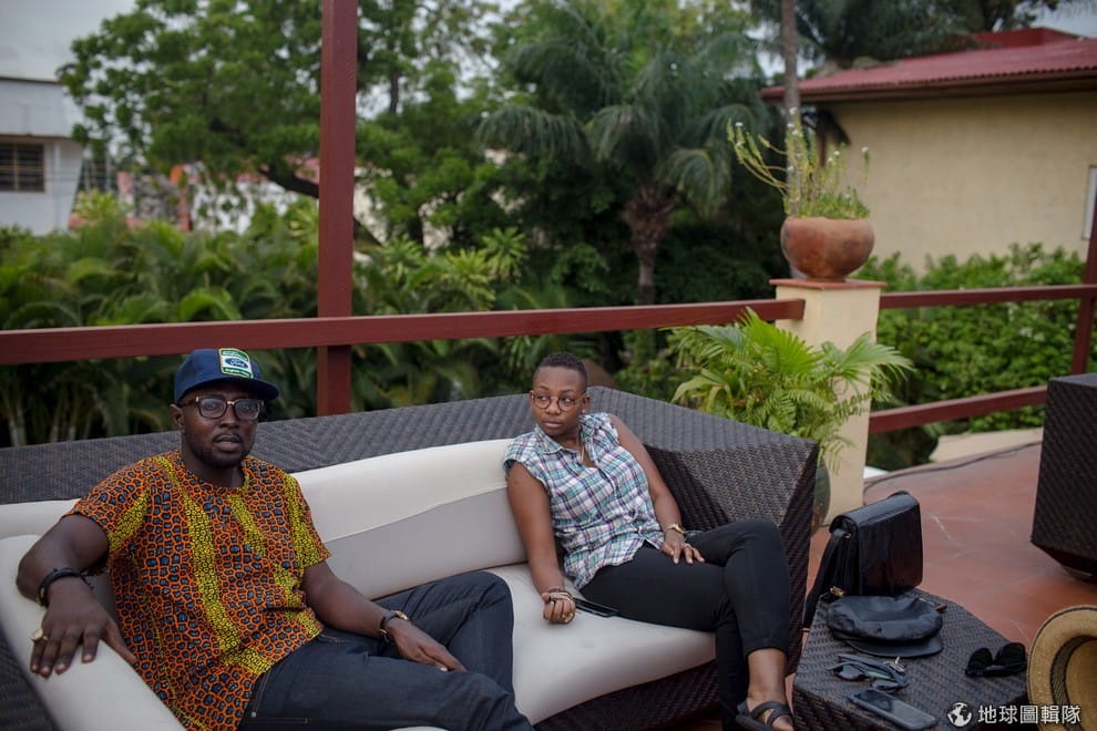 路透社迦納知名的時尚部落客艾倫(Allen Coleman,左)與朋友在旅館閒聊。