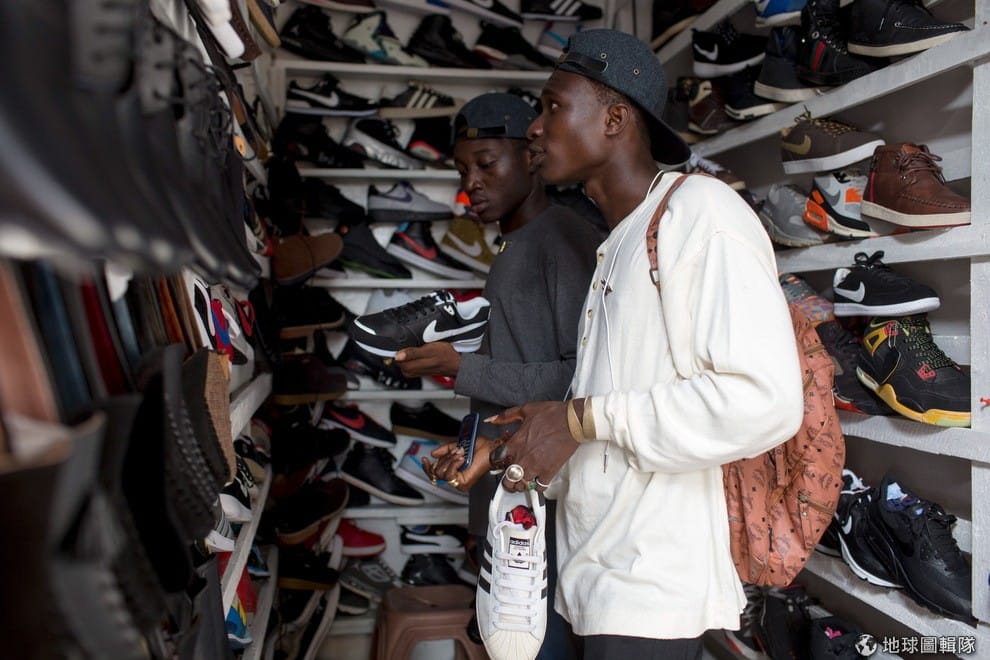 路透社基斯與其他年輕人想在迦納當地掀起不同的流行旋風,圖中是同屬一個團體的派翠克(Patrick)和納那(Nana Kwes),他們兩人剛結束跟客戶的會議,兩人到市場中挑鞋。
