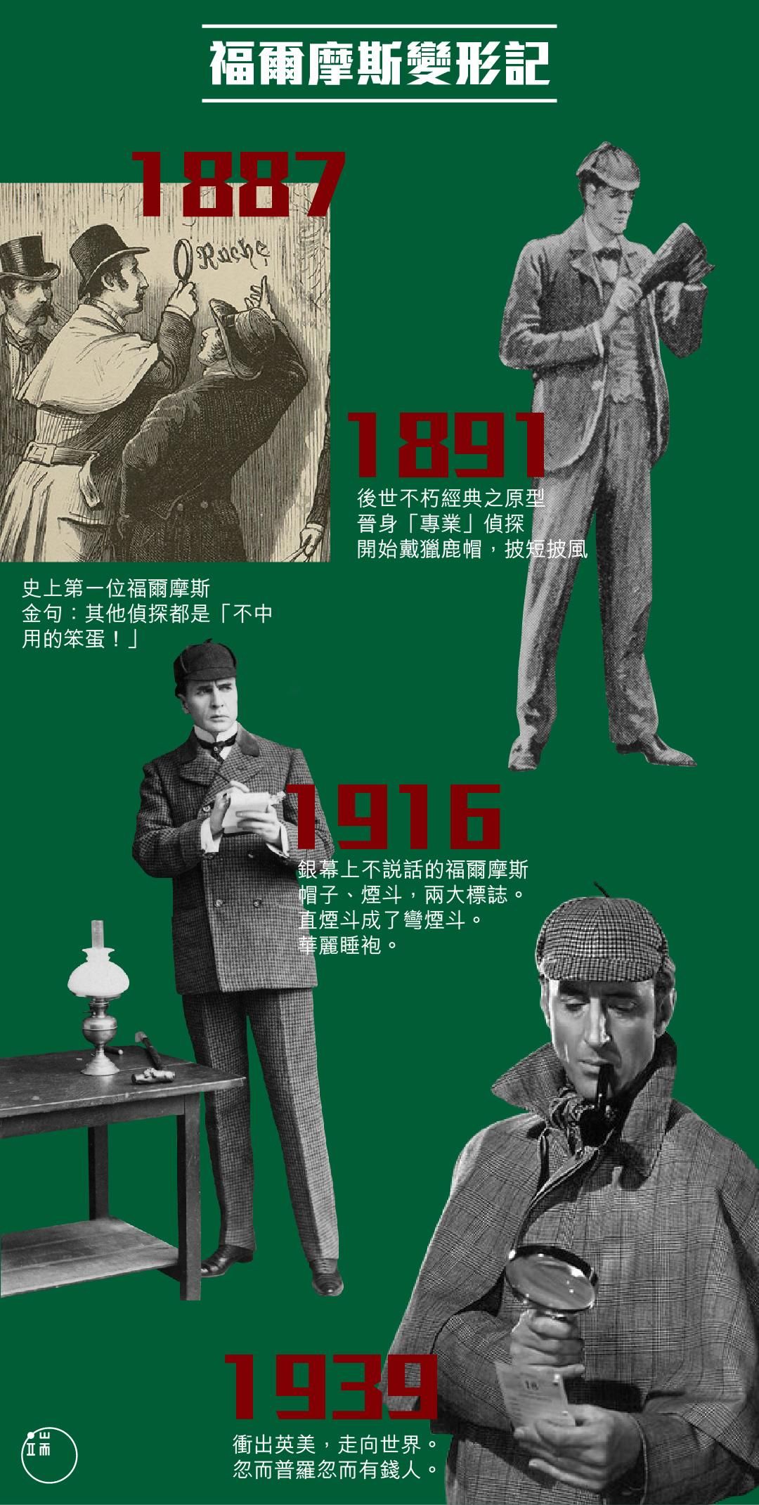 獵鹿帽和圓領短披風第一次出現在他身上,獵鹿帽是插畫師 Sidney Paget 的想像,他手上的放大鏡則是柯南.道爾的。從這裏開始,這個業餘「諮詢偵探」開始有了實幹家的派頭,風雨交加的天氣裏,這身行頭特別實用。