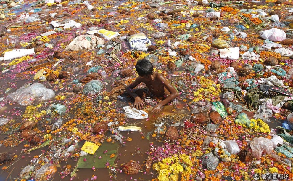 一名男孩在象頭神節慶過後的河水中,撿拾還可以使用的資源。