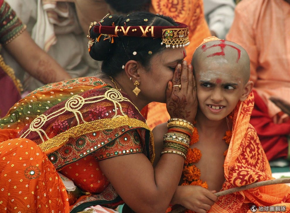 在印度教婆羅門男孩的入教典禮上,一名婆羅門母親附在兒子耳邊說悄悄話。