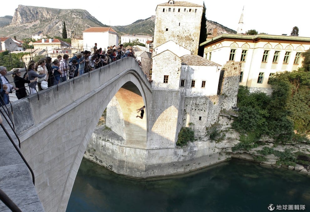 賽拉耶佛當地一處高橋上,人們正看著參加跳水競賽的選手一躍而下。