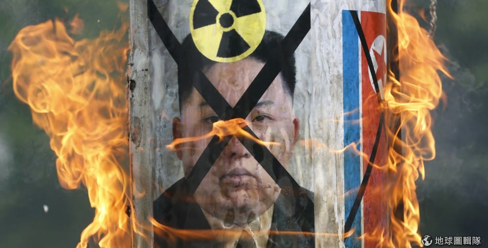 目前北韓仍不放棄用核武,對鄰近國家而言是一大威脅。圖為南韓人民焚燒北韓領導人金正恩的相片。