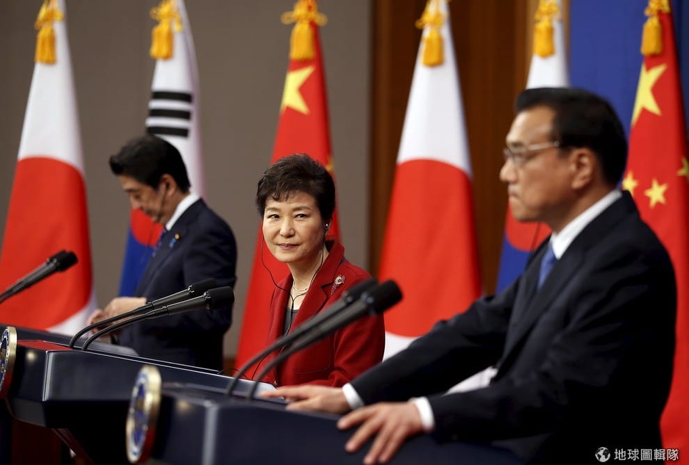 左起為日本首相安倍晉三、南韓總統朴槿惠以及中國國務院總理李克強。這次的中日韓高峰會在 1號這天落幕。