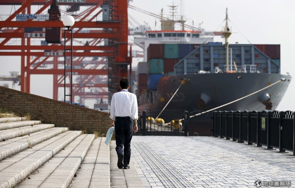 一名男子緩緩走向停在東京港口的貨櫃船。隨著中國經濟發展放緩,連帶日本貿易也受影響。