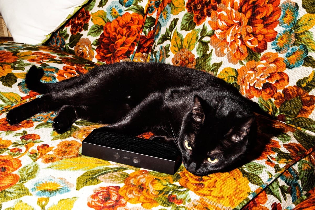 黑貓「口袋」舒服的窩在音響旁聽「貓音樂」。 取自紐約時報