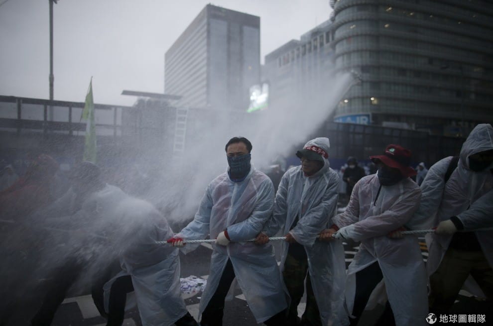 首爾的示威現場,一名示威者在警察噴出強力水柱時高舉著手。