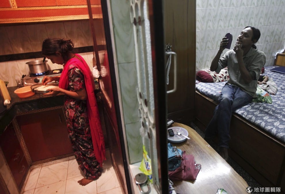 在印度,煮飯、洗衣等家務活大部分還是由婦女負責,就算職業婦女也一樣。圖為一名妻子正在煮飯,隔壁房間的先生在攬鏡自照。