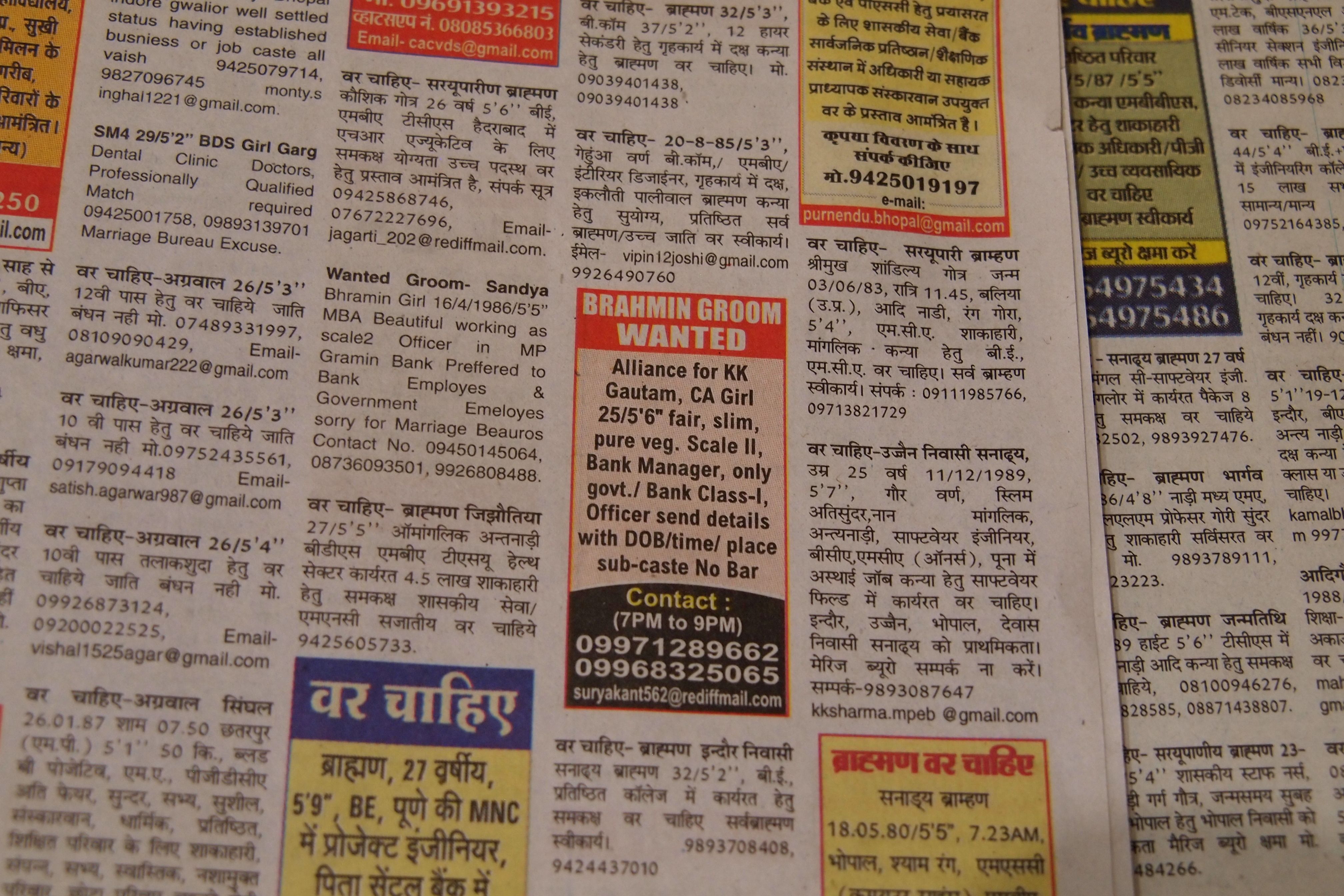 印度報紙的相親廣告上可以看到,膚色白皙、身材苗條的女子在徵求來自婆羅門家庭的新郎。