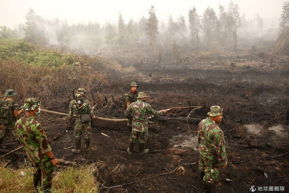 印尼也派出軍人前往災區滅火,原本翠綠的森林被大火燒得亂七八糟。