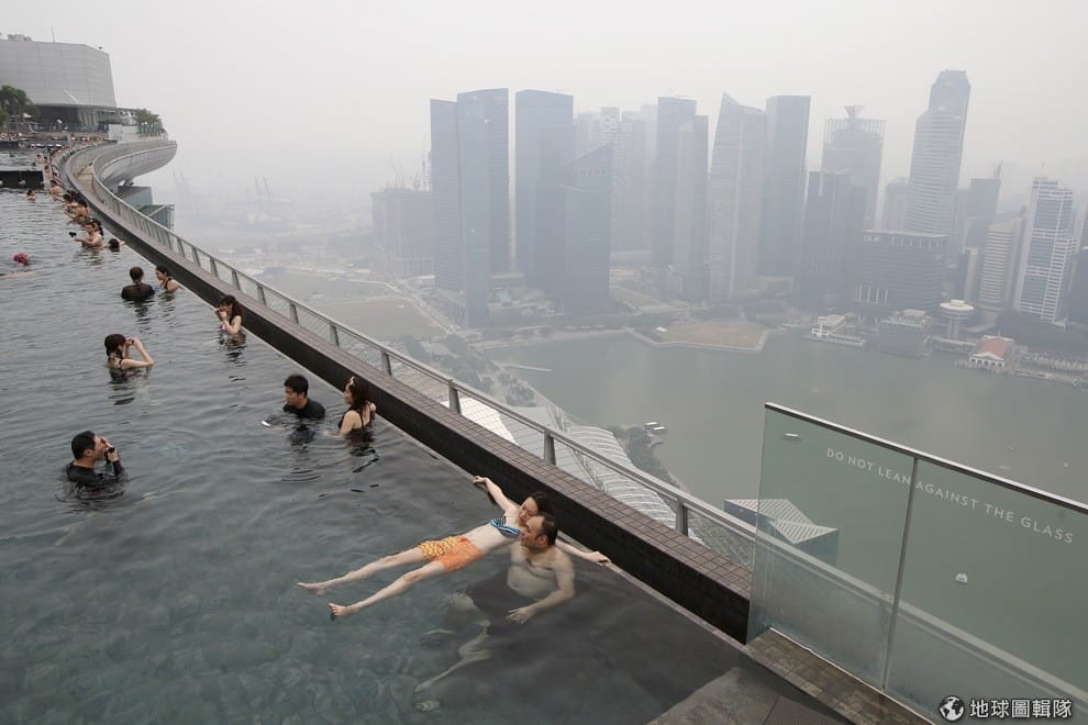 路透社印尼大火引起的濃煙飄到鄰國造成霾害,圖為新加坡無邊際泳池因為濃霧而看不清對面的高樓大廈。