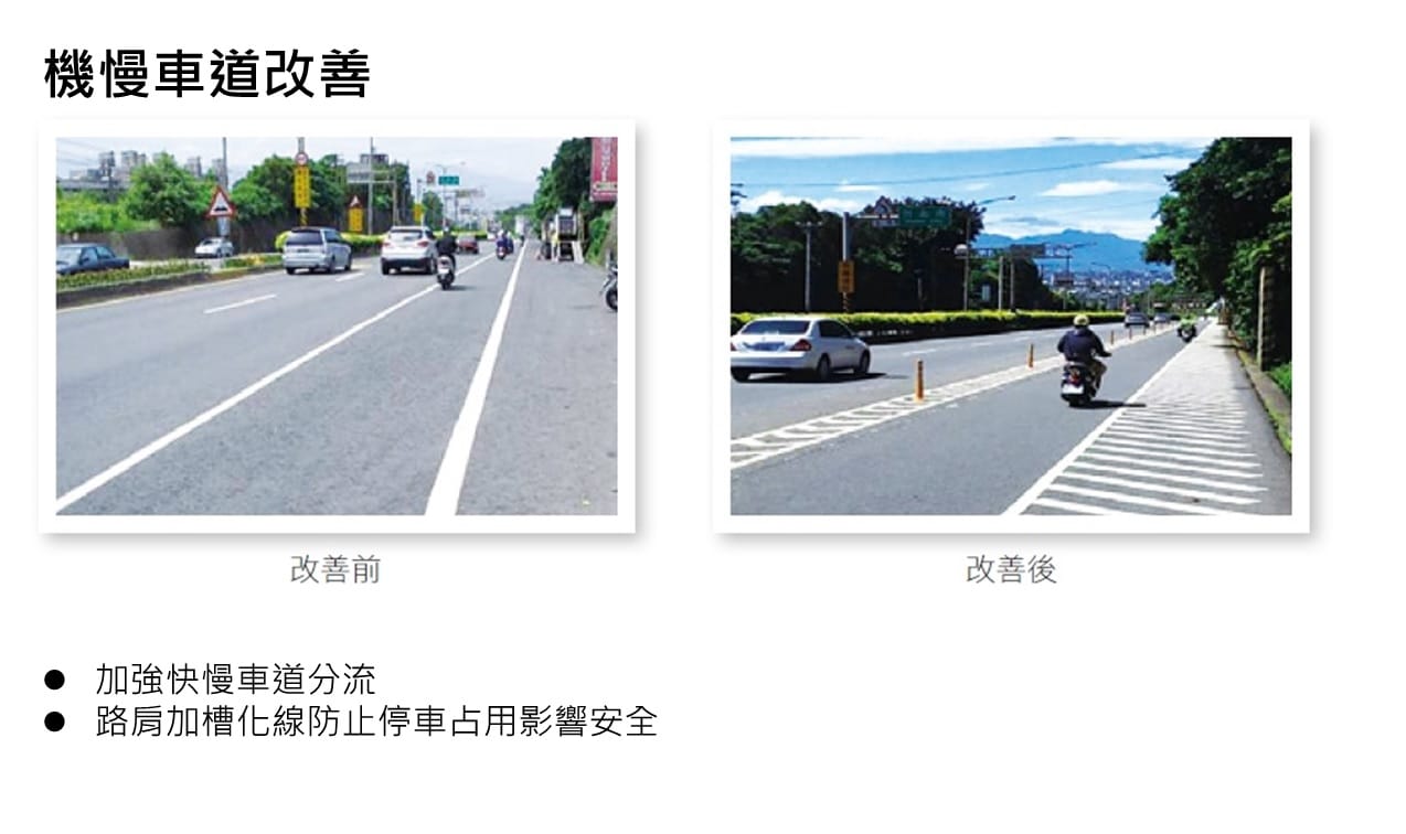 為了讓機車騎士能安全通行,除了運用交通桿和槽化線加強快慢車道分流外,路肩的部分也開始有槽化線出現,防止停車者阻礙騎士。